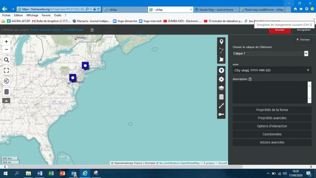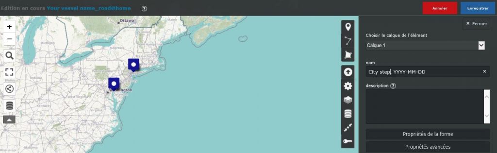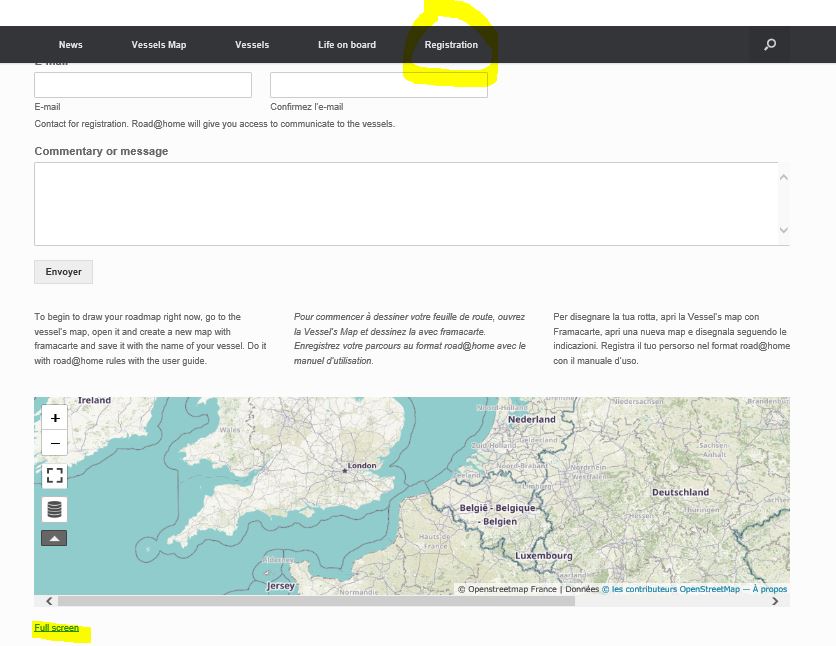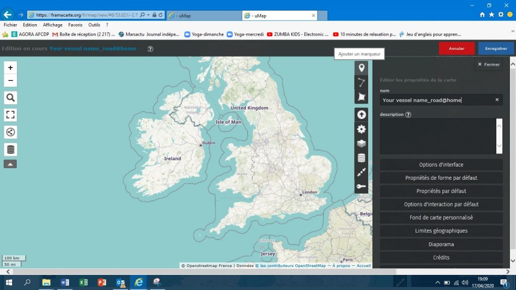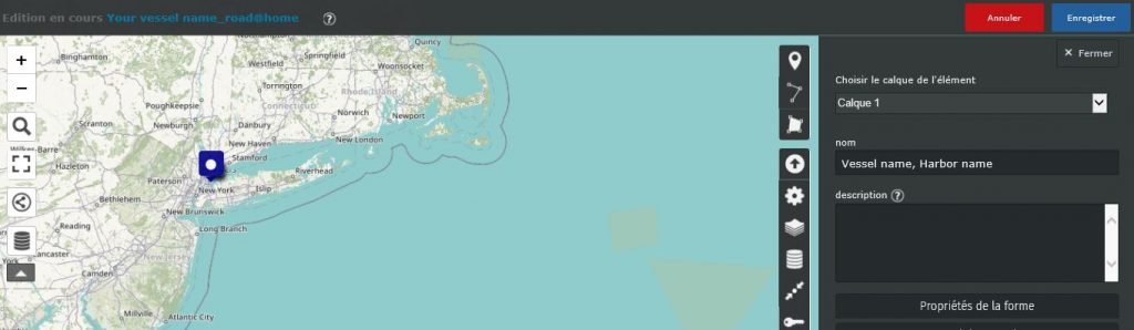 If you wish, you can begin to draw your roadmap right now by yourself with the map and the user guide bellow. Go to the map, open it fullscreen and create with framacarte and save it with the name of your vessel. Do it with road@home rules bellow.